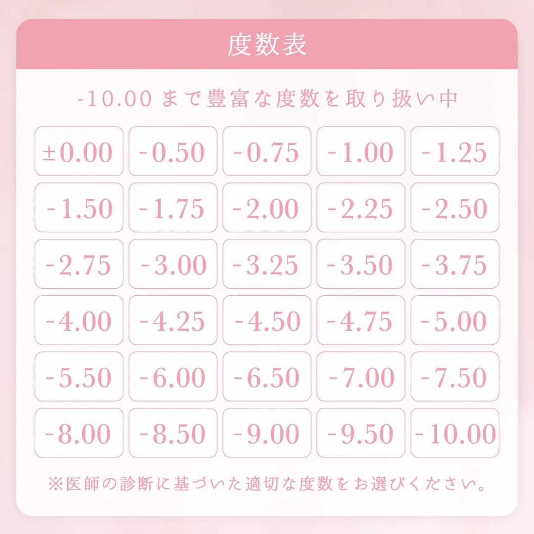 | 度数(PWR) | ±0.00D -0.50D~-5.00D(0.25Dステップ) -5.50D~-10.00D(0.50Dステップ) |